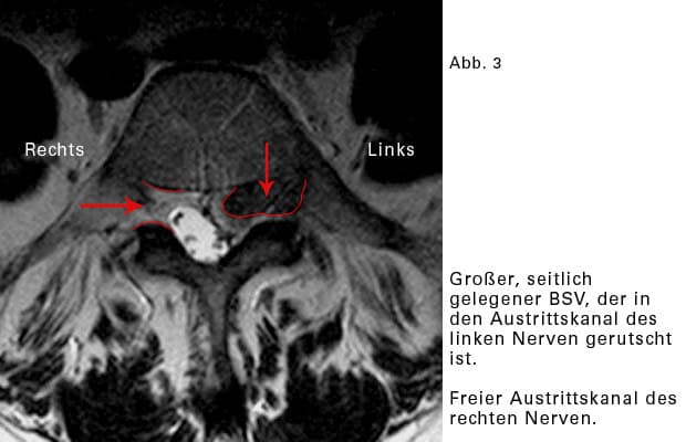 Der Riss des Faserringes liegt seitlich, rechts oder links. Der Vorfall rutscht in den seitlichen Teil, und zwar in den knöchernen Austrittkanal eines Nerven. Hier ist relativ wenig Raum, und eine Quetschung der Nervenwurzel eher wahrscheinlich.