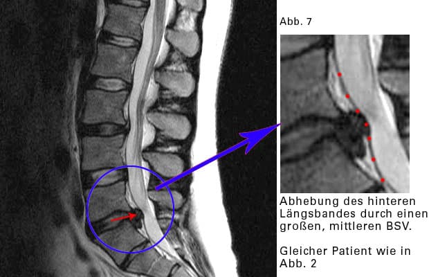 Das hintere Längsband wird durch einen BSV „ausgebeult“. In jedem Band des Körpers befinden sich Nervenrezeptoren. Sie registrieren Spannungen und Schmerzen und leiten ihre Messergebnisse weiter an das Rückenmark, an das Gehirn. Wird das hintere Längsband „ausgebeult“ und durch Bücken zunehmend gedehnt, dann „funken“ die Nervenrezeptoren: es schmerzt.