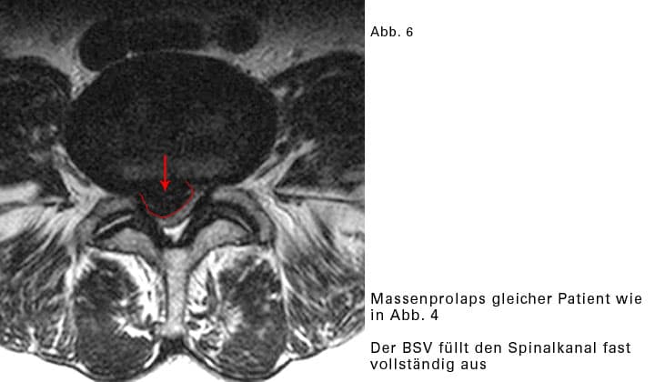 Wenn sehr viel Material des Gallertkernes austritt, wird der BSV Massenprolaps genannt. Dadurch wird im Wirbelkanal sehr viel Platz beansprucht. Es wird sehr eng für sämtliche Nervenwurzeln, die an dieser Stelle vorbeiziehen. Mehrere Nervenwurzeln können gleichzeitig gequetscht werden. Das Beschwerdebild ist entsprechend vielschichtig. Glücklicherweise kommen Massenvorfälle selten vor.