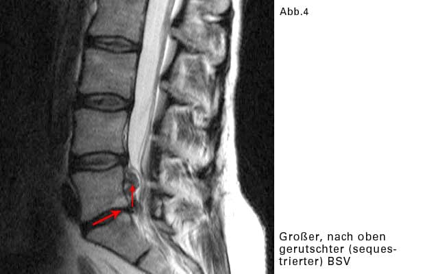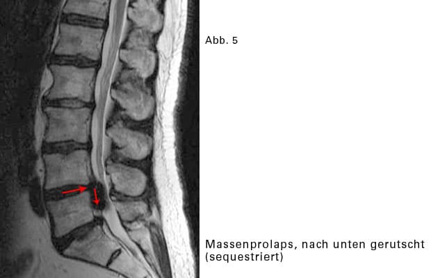 Das vorfallende Gallertgewebe löst sich von der restlichen Bandscheibe und rutscht im Wirbelkanal etwas nach oben oder nach unten.