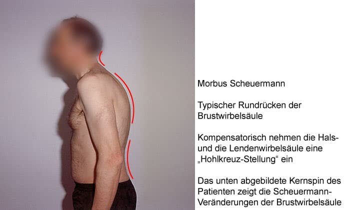 Ist die WS nur gering bis mittelgradig von der Wachstumsstörung befallen, verläuft die Erkrankung beschwerdefrei. Sie fällt nur durch den sich bildenden Rundrücken auf, seltener durch den Flachrücken.