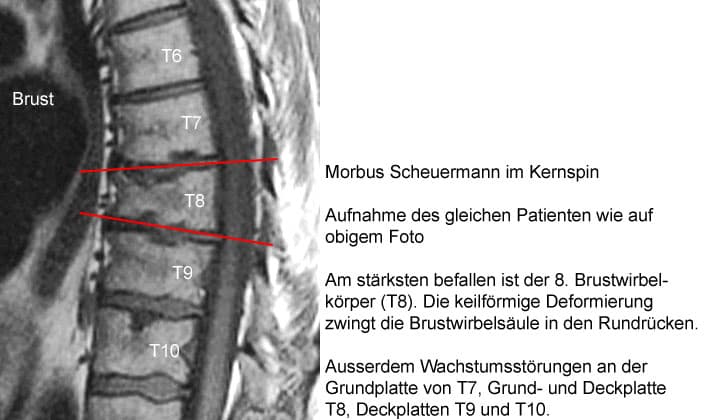 Mit Abschluss des Wachstums kommt der M. Scheuermann zum Stillstand. Er ist "ausgebrannt". Das Endstadium ist eine mehr oder weniger verformte WS. Die von der Erkrankung betroffenen WS-Abschnitte steifen in ihrer Fehlform ein.