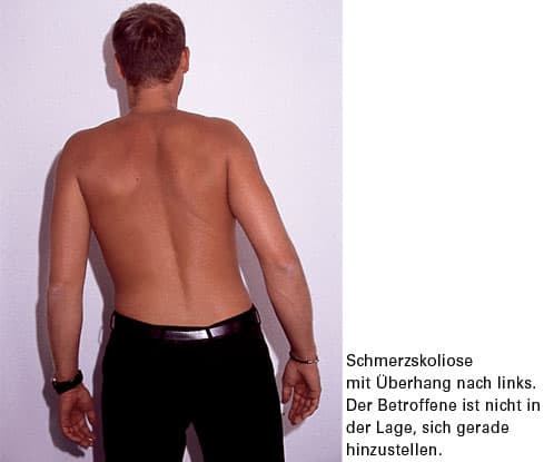 Der Schmerz verursacht oft eine schmerzbedingte Bewegungseinschränkung und eine Fehlhaltung der WS (eine sog. Schmerz-Skoliose).