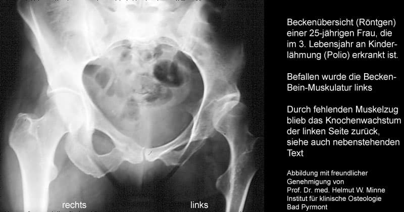 Beispiel: Ein 3-jähriges Mädchen erkankt an Kinderlähmung (Poliomyelitis). Befallen ist die Becken-Bein-Muskulatur links. Durch fehlenden Muskelzug wird das Knochenwachstum der linken Beckenhälfte und des linken Beines nicht stimuliert.