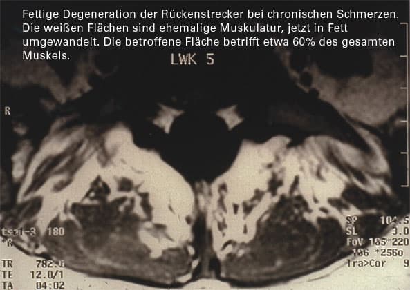 Das untere Bild zeigt einen Muskel bei Dauerschmerzen, die seit 5 Jahren bestehen: etwa 60% des aktiven Muskelgewebes ist in Fett umgewandelt (weiße Fläche).