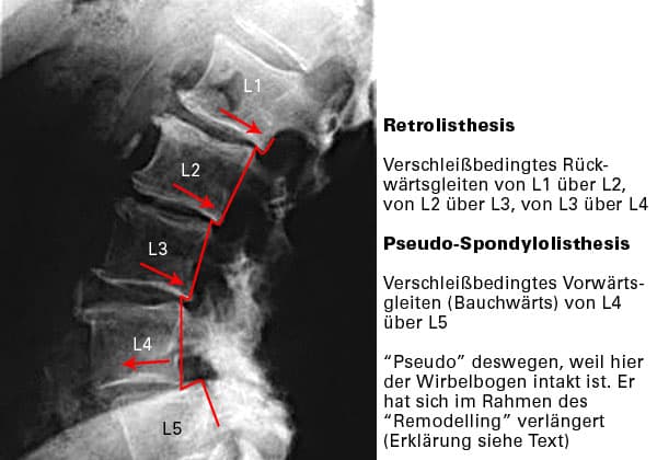 Je nachdem, ob die Wirbelgelenke steiler oder flacher stehen, gleitet der Wirbel bei verschlissener BS nach vorne (Pseudo-Spondylolisthesis) oder nach hinten (Retrolisthesis).